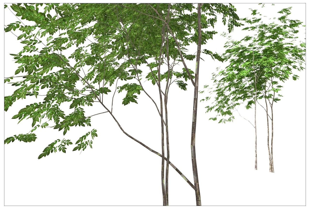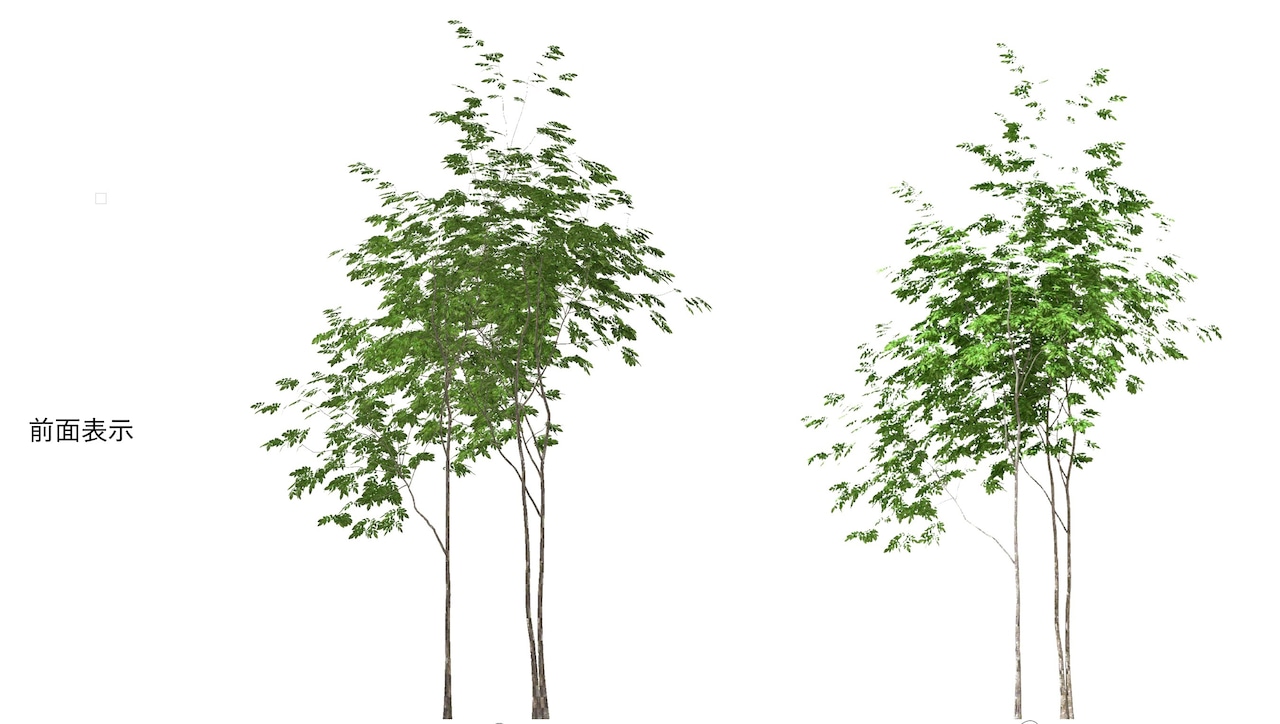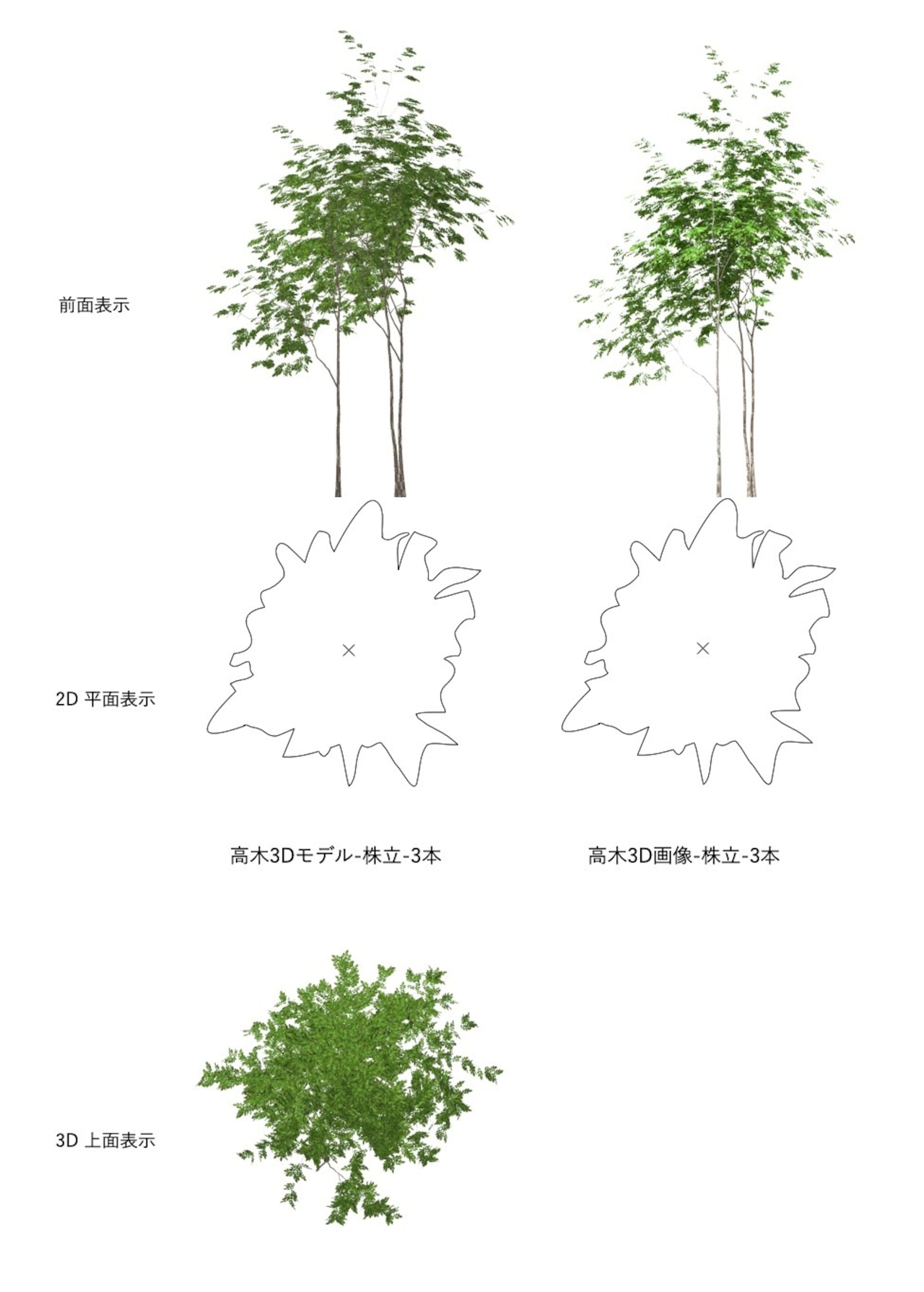 データは重いですがリアリティのあるフルモデリングのタイプと背景などに向く画像タイプの二つがセットになっています。近くで見るような場合はフルモデリングの樹木を使い、それ以外は画像の樹木を使うことでデータを軽くしつつリアリティあるパースを作ることができます。